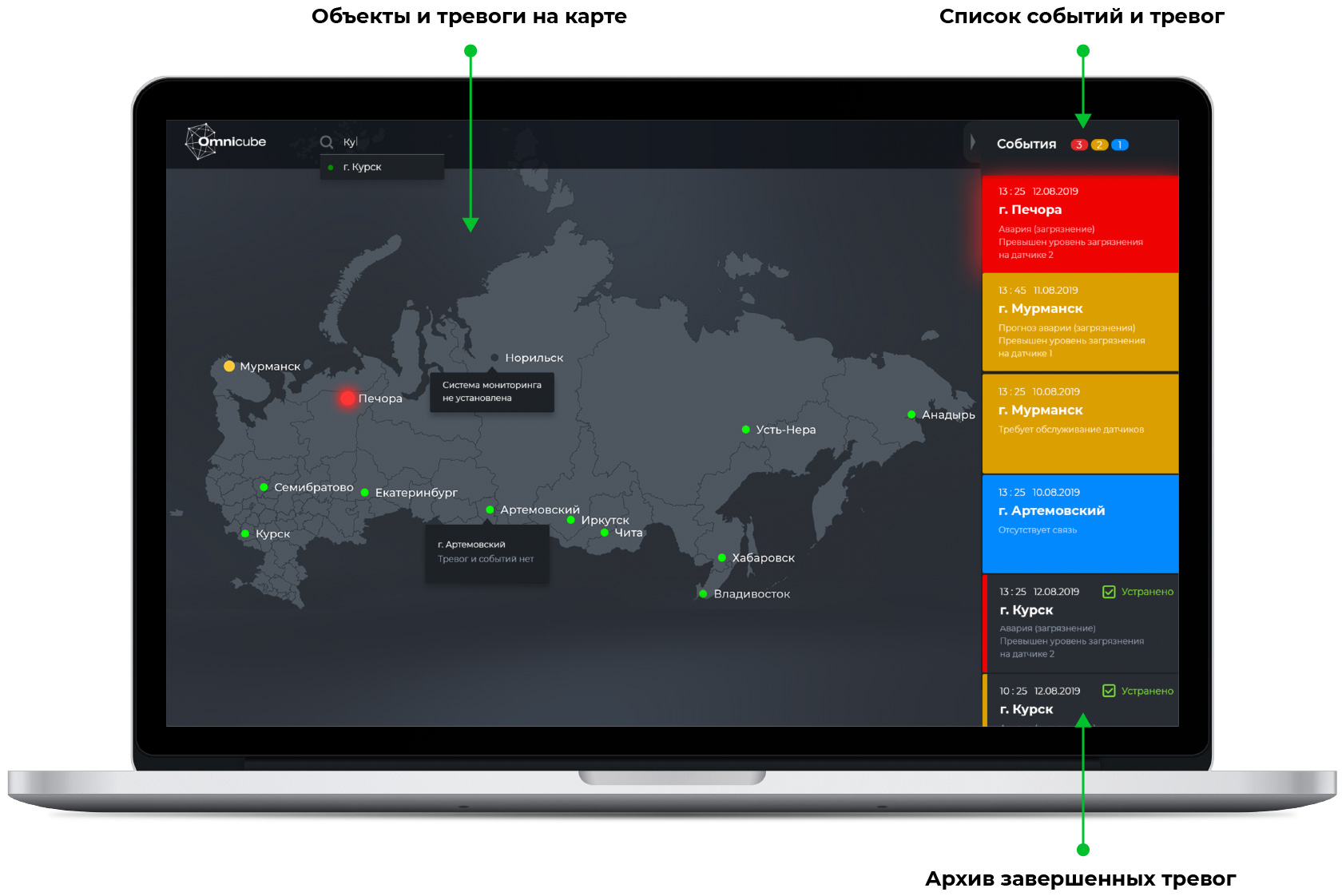 Платформа Omnicube служит основой для решений экологического мониторинга, позволяющих предприятиям снизить потенциальный риск экологического ущерба и связанных с этим финансовых потерь. Система осуществляет автоматический непрерывный анализ концентрации загрязняющих веществ (например, в выбросах предприятий), графическое представление результатов, подготовку отчетов и рассылку тревожных оповещений по факту нарушения нормативов или нештатных ситуаций.