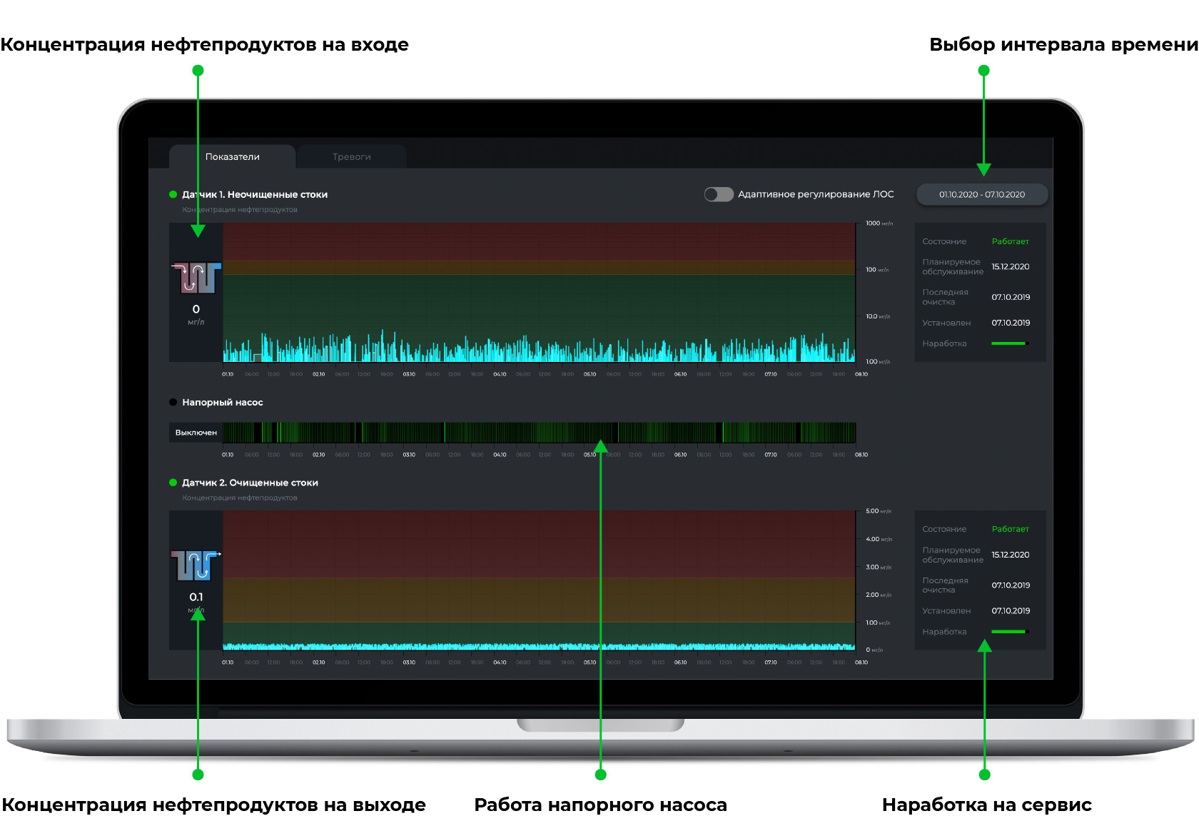 Графический интерфейс системы отображает текущую ситуацию и статистику как по всему предприятию, так и по конкретной точке мониторинга, например, по очистным сооружениям.