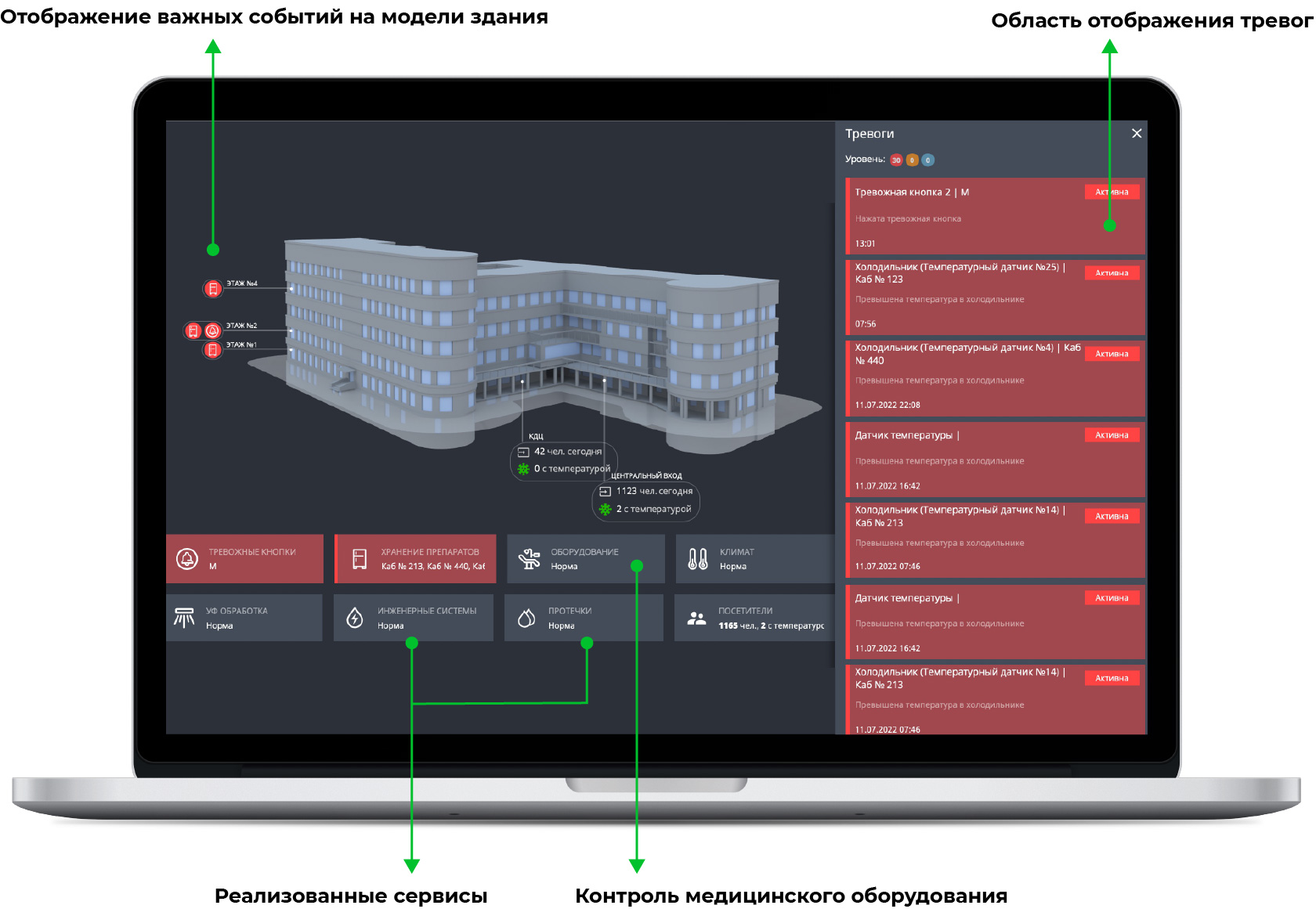 Предусмотрена установка нормативов и логических правил по контролируемым параметрам. Система сама отправит оповещения ответственным сотрудникам в случае обнаружения нарушений или событий, требующих вмешательства (например, подошел срок обслуживания медицинского оборудования, превышена температура хранения вакцины, поступил вызов с браслета пациента).