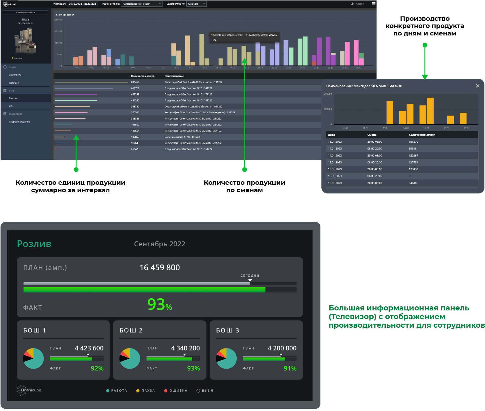 Система отображает текущий статус и статистику работы оборудования, информацию о режимах работы, о количестве выпущенной продукции, а также позволяет оперативно реагировать на возможные неполадки и оптимизировать сервисное обслуживания.